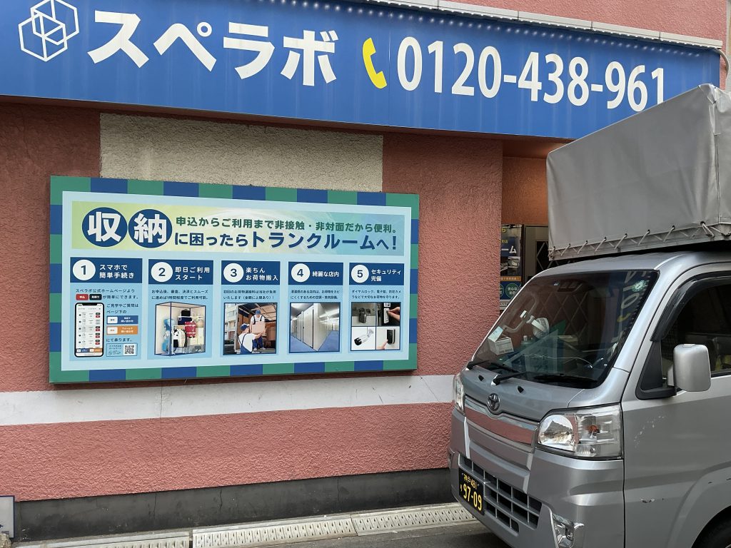 さらに足を伸ばし、工場と住宅が混在する「ハローストレージ港区南市岡」へと向かいました。こちらではお客様がご自身で組み立てた頑丈な木製シェルフの搬入がありましたが、そのままではかさばるため、インパクトドライバーを使ってスピーディに解体を行いました。屋外型トランクルームの床面に直接荷物が触れるのを避けるため、搬入前にキーパーシートを敷き詰め、その上に解体した木材や荷物を整然と配置して汚れや湿気から守る工夫を凝らしました。